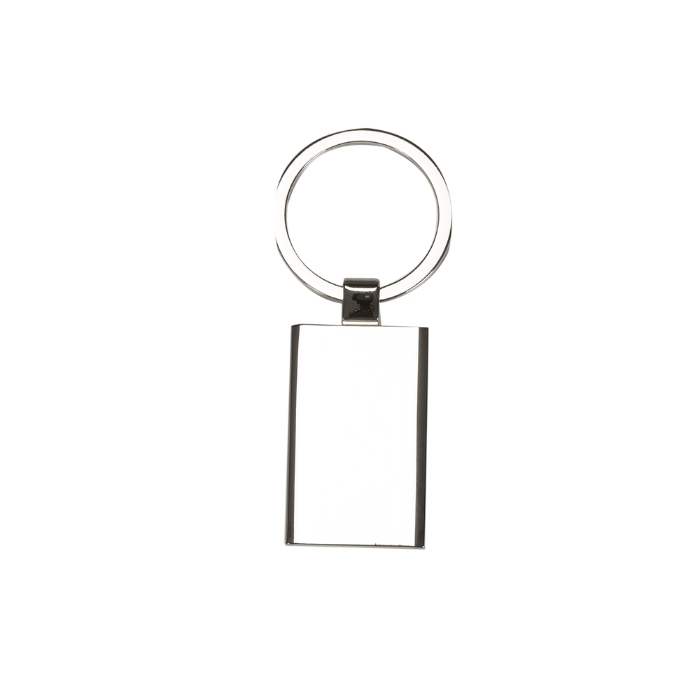 Descrição: Chaveiro de metal retangular com chapa central, verso liso.